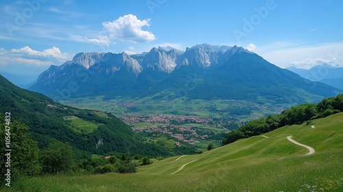 mountain, vale, town, village, hill, grass, green, field, sky, cloud, blue, nature, landscape, scenic, scenic view, summer, travel, wilderness, rural, environment, park, beautiful, majestic, peace, calmness, serene, breathtaking, panorama, scenery, picturesque, vista, horizon, mountain chain, peak, summit, alpine, countryside, meadow, pasture, hillside, slope, hiking, walking, path, trail, road, pathway, fresh