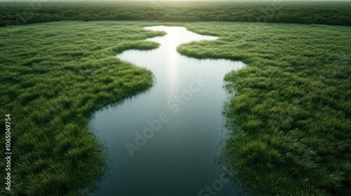 A scenic vista showcasing a sinuous waterway meandering through lush grasslands, captured at sunrise, emphasizing natural beauty, serenity, and the expanse of nature.