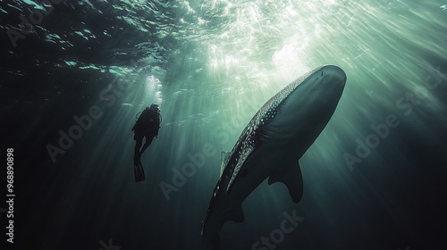 A scuba diver swims beneath a majestic whale shark, bathed in the ethereal light of the sunbeams piercing the surface of the water.