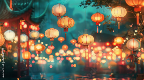 A sea of decorative lanterns each one illuminated by a soft glow adding a touch of magic and charm to the lively night market beneath.