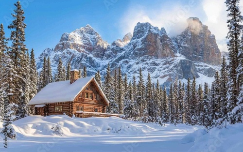 A secluded winter cabin at the edge of a snowy forest with towering peaks in the background