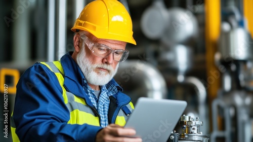 A senior worker wearing a hard hat and safety goggles checks information on a tablet while overseeing operations in an industrial facility filled with machinery and equipment