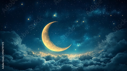 A serene and dreamy depiction of a crescent moon shining brightly in the night sky, surrounded by stars and clouds.