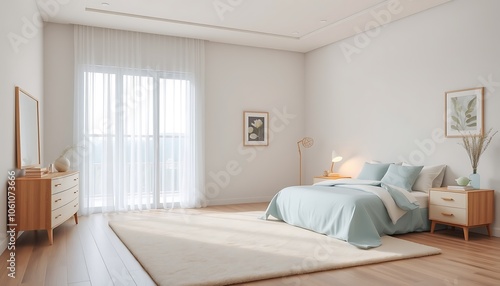 A serene and peaceful bedroom with a plush, cream-colored area rug, a large, floor-to-ceiling window with sheer white curtains, and a comfortable, oversized bed dressed in soft, sky-blue linens.
