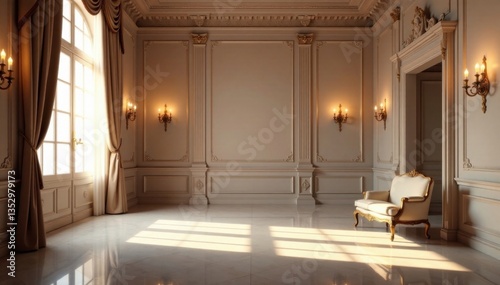 A serene and peaceful empty room with ornate furniture and subtle lighting in a grandiose setting, ornate, high ceiling