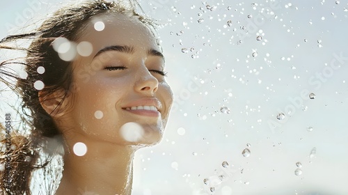 woman, face, portrait, water, drop, droplet, freeze, glacé, motion, dynamic, minimalist, bright, clean, fresh, serene, ambient, atmosphere, vitality, energy, natural, environment, sky, light, airy, aethereal, beauty, wellness, purity, calmness, essence, elegance, grace, youth, glow, radiance, serenity, harmony, calmness, meditation, contemplation