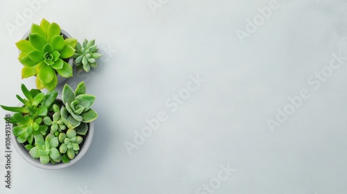 A serene arrangement of assorted succulents in a gray pot, showcasing various green textures against a pale background.