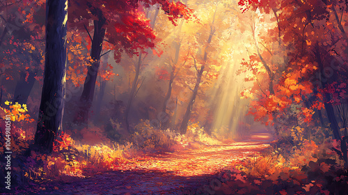 A serene autumn forest path covered in fallen leaves, surrounded by vibrant orange, red, and yellow trees, with soft sunlight streaming through the branches