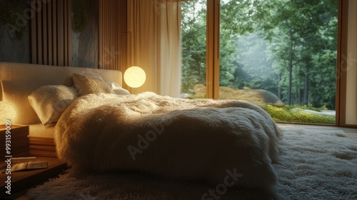 A serene bedroom with a fluffy bed and warm lighting, highlighting the peaceful nature view outside.