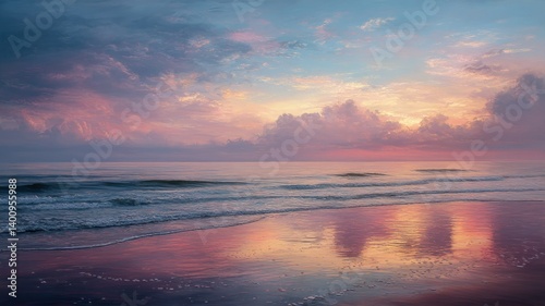 sea, ocean, water, beach, shore, sand, sunset, sunrise, cloud, sky, landscape, seascape, horizon, coastal, coastline, tide, wave, calm, peaceful, serene, tranquil, pink, purple, orange, blue, dreamy, scenic, aethereal, nature, beauty, twilight