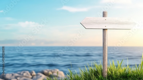 A serene coastal scene featuring a wooden signpost by the water, surrounded by grass and rocks under a clear sky.