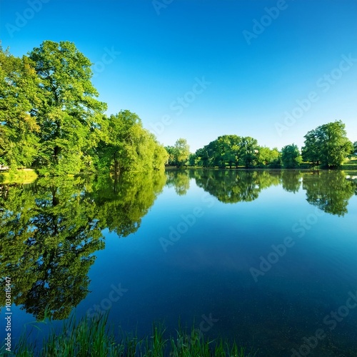 a serene countryside lake the surface reflecting the vibrant green trees and clear blue sky with perfect clarity