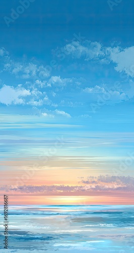 sky, sunset, sunrise, cloud, sea, ocean, horizon, calm, peaceful, tranquil, vibrant, colours, pastel, painted, digital, art, blue, pink, orange, white, light, gold, warm, gentle, water, wave, nature, landscape, beautiful, dreamy, artistic, impressionistic, soft light, abstract, poster, background, wallpaper, impressionism, digital artwork