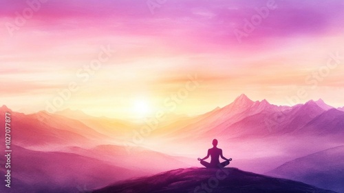 A serene figure meditating at sunrise, surrounded by majestic mountains under a colorful sky filled with pink and purple hues.