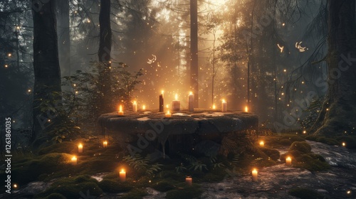 A serene forest scene featuring a circular stone altar surrounded by glowing candles, bathed in soft golden light and magical fireflies. AI generated.