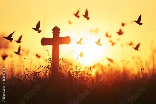 sunrise, golden hour, cross, dove, bird, flight, peace, faith, hope, religion, spirituality, christianity, easter, good friday, religious, golden light, warm light, tranquil, serene, nature, sky, silhouette, freedom, redemption, ascension, blessing, divine, belief, soft light, blurred background, quiet, contemplation, rural, holy, aethereal, calm, peaceful, dawn, rebirth, morning light, inspiration