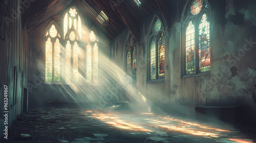 A serene interior of an abandoned building with light streaming through stained glass windows. Abandoned Building. Illustration