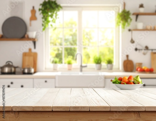 kitchen, interior, wooden, table, empty, space, white, clean, modern, bright, sunny, window, green, plant, bowl, salad, fruit, vegetable, healthy, eating, culinary, cooking, utensil, pot, pan, kitchen utensile, shelf, cabinet, sink, faucet, blurred, background, peaceful, calm, serene, natural, light, warm, cosy, home, house, room, decor, design, still, life, daytime, morning, freshness