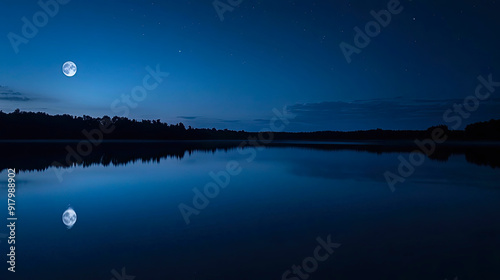 A Serene Lake Reflecting a Full Moon Under a Starry Sky on a Tranquil Night