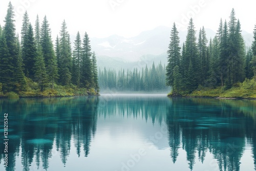 A serene lake surrounded by tall evergreen trees, reflecting the peaceful scenery and enveloped in a gentle mist, perfect for nature lovers and tranquility.