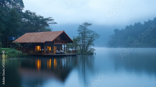 A serene lakeside view with calm waters and misty ambiance. -