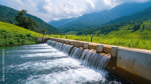 A serene landscape featuring a clear river cascading over a dam, surrounded by lush green hills and a vibrant sky.