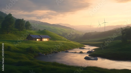 A serene landscape featuring a cozy house by a flowing river, surrounded by lush greenery and wind turbines against a beautiful sunset.