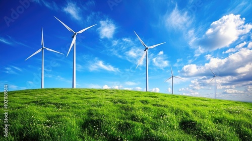 A serene landscape featuring a field of green grass and windmills in the distance, suitable for use in environmental or rural-themed projects