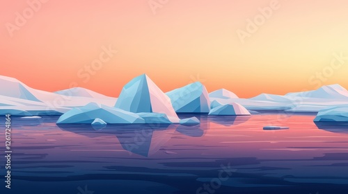 A serene landscape featuring icebergs reflecting in calm waters under a pastel sunset sky.