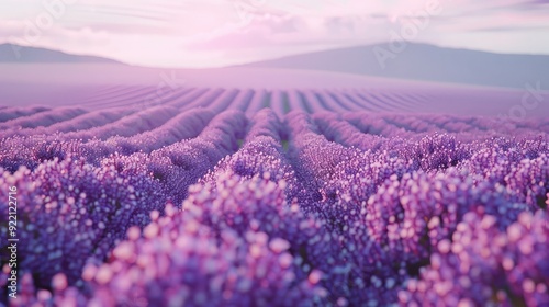 A serene lavender field background with rows of blooming flowers under a soft morning light, offering tranquility