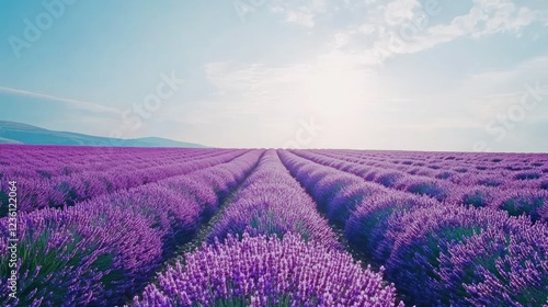 A serene lavender field under a bright sky, showcasing rows of vibrant purple flowers.