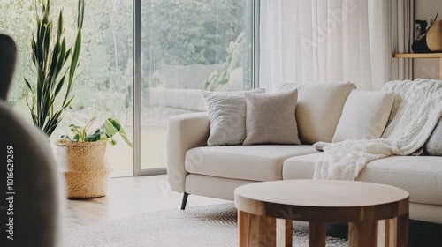 A serene living room interior with contemporary furniture, natural lighting, and stylish decor, perfect for showcasing a cozy home atmosphere