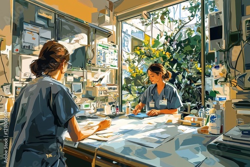A serene medical office scene featuring two healthcare professionals engaged in work, surrounded by greenery and natural light.