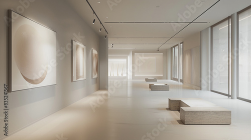 A serene, minimalist gallery with clean lines and abstract art pieces, creating a tranquil, sophisticated environment.