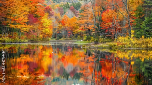 A serene pond is surrounded by trees in full fall foliage, with the colorful leaves creating a beautiful reflection on the calm water's surface