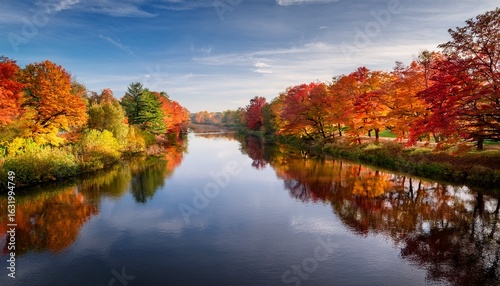 a serene river reflects the vibrant colors of autumn trees lining its banks creating a picturesque landscape that embodies tranquility and the beauty of nature