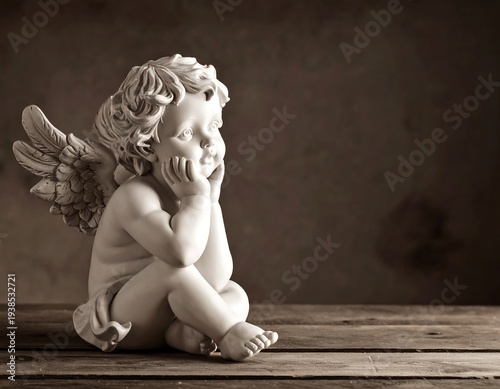 angel, statue, cherub, wing, serene, vintage, sepia, sculpture, white, antique, wood, table, thoughtful, pensive, resting, contemplating, calm, peaceful, beautiful, innocence, detail, pose, classic, image, artistic, light, studio, home, decor