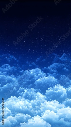 A serene sky filled with vibrant blue hues and fluffy clouds, evoking a calm and peaceful atmosphere. The scene is accented by twinkling stars above the clouds.