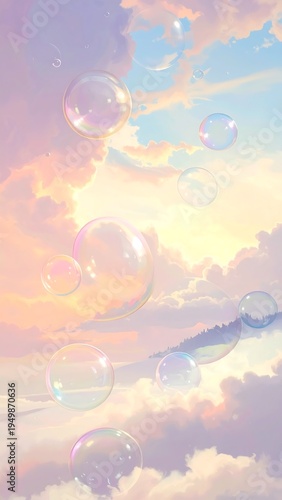 A serene sky with pastel colors and floating bubbles