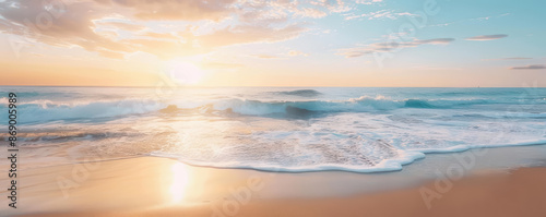 A serene sunset over a pristine beach with soft waves lapping at the shore, perfect for unwinding
