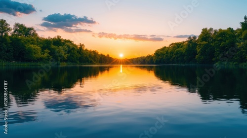 A serene sunset reflects on a calm river, surrounded by lush greenery and a clear sky, creating a peaceful natural scene.
