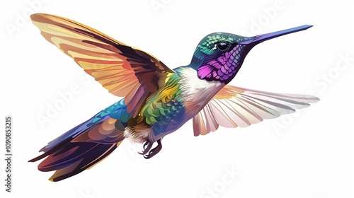 A serene vector image of a delicate hummingbird with iridescent feathers, hovering effortlessly in the air, set against a white background, emphasizing its graceful and agile nature.