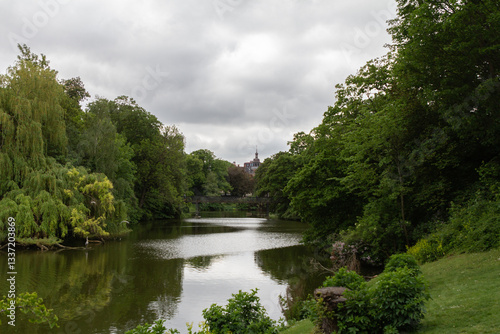 A serene view of a river running through Copenhagen, surrounded by lush green trees.