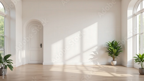 A serene white-walled room features a gracefully arched doorway, adorned with a sleek black handle to the right. A nearby window adds subtle light, enhancing the tranquil atmosphere