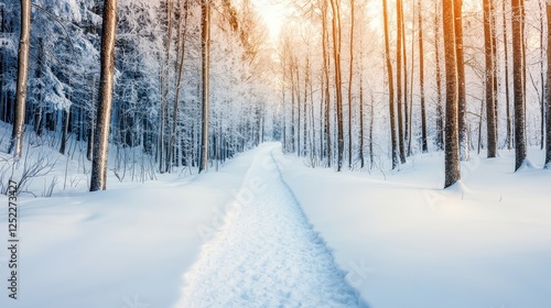 A serene winter landscape features a snow-covered path winding through tall trees, illuminated by warm sunlight filtering through the frost.