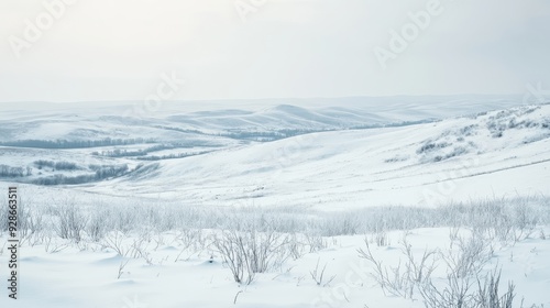 A serene winter landscape with rolling snow-covered hills under a pale sky.
