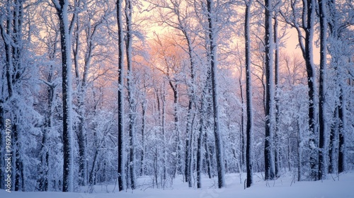 A serene winter landscape with snow-covered trees and a pastel sky at sunset.