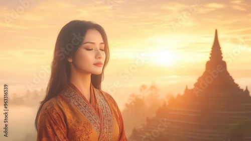 woman, meditation, temple, sunrise, serenity, culture, peace, spirituality, heritage, landscape, female, scenic, joy, ethnic, flair, art, beauty, travel, scene, racked, sunset, clothing, nature, colours, glow, charme, style, model, evening, tranquil, cloud, dusk, practice, people, young, attire, breeze, asian