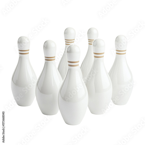 A set of clean, white bowling pins neatly arranged in a triangular formation isolated on transparent background (4)