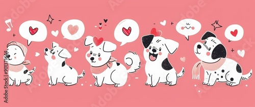 A set of cute cartoon dogs in various poses, wearing colorful and accessories like scarves or hats with hearts on them. pink background, love hearts, flowers, candy